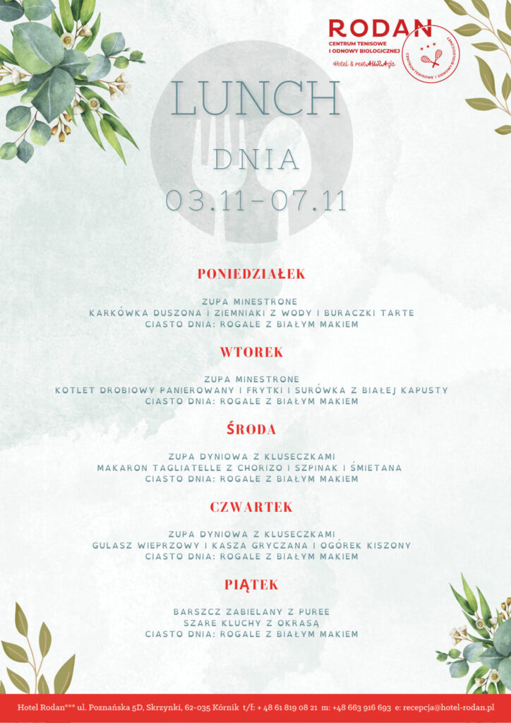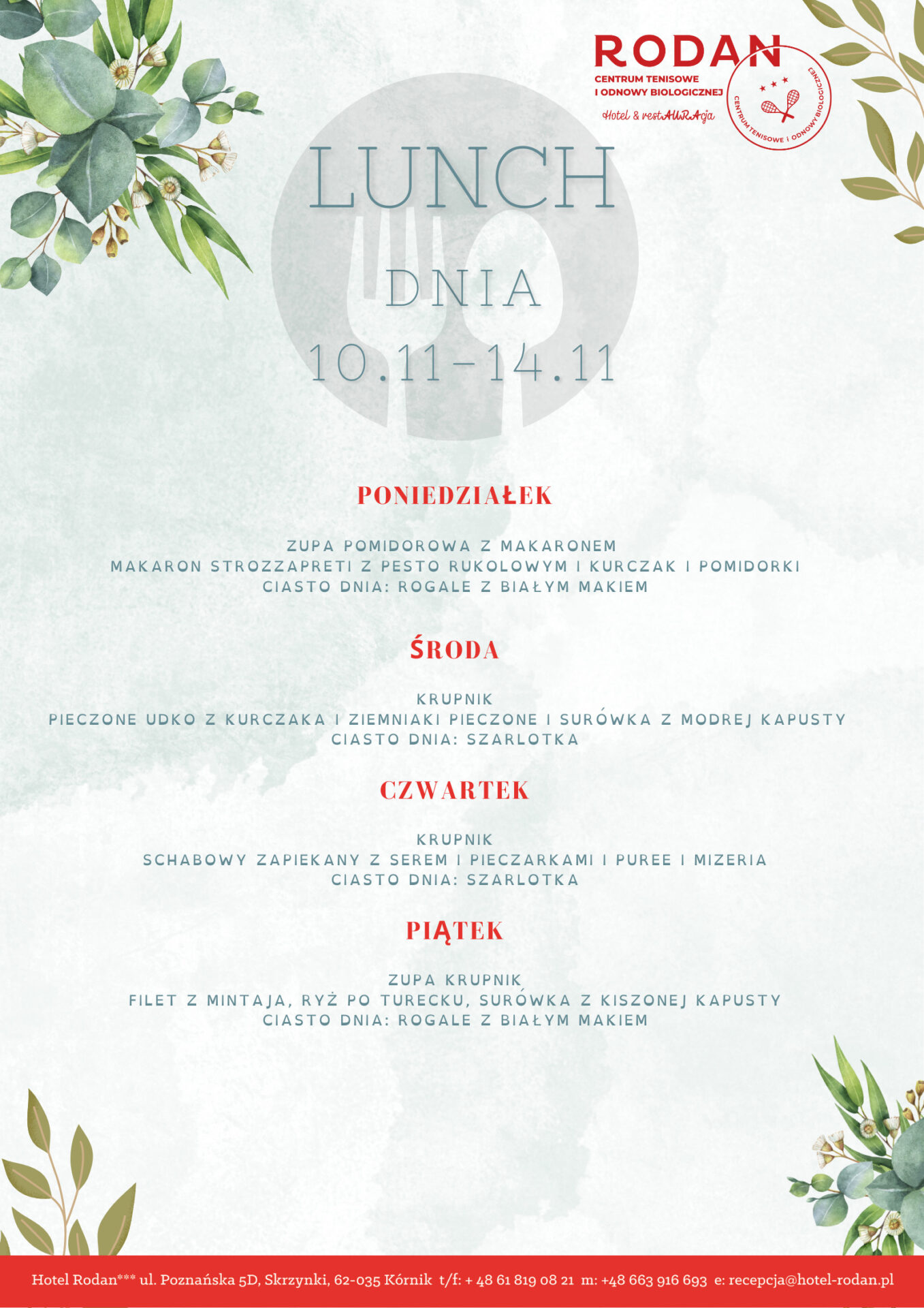 Lunch dnia w restAURAcji Hotelu Rodan Od poniedziałku do piątku, w godzinach ⏰ 12:00-16:00, serwujemy w naszej restAURAcji wspaniałe, dwudaniowe obiady. A dla osłody, nasi cukiernicy przygotowują dla Państwa przepyszne ciasta i desery. Potrzebujesz catering do firmy? Załatwione! Zadzwoń, zamów dla minimum 10 osób dwudaniowy zestaw, a dostarczymy go pod wskazany adres. Cena zestawu zupa + danie główne: 35 PLN Zupa: 10 PLN Danie Główne: 27 PLN Deser: 16 PLN Transport: do ustalenia w zależności od lokalizacji i wielkości zamówienia.