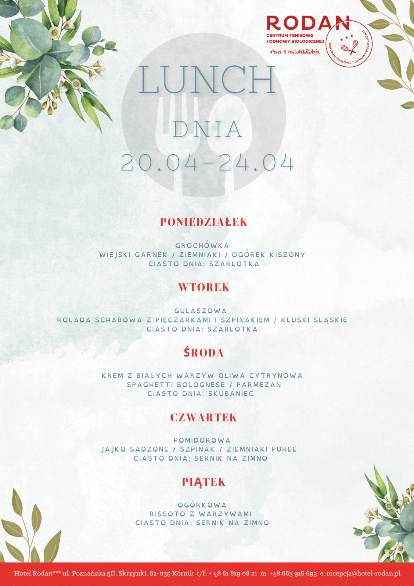 Lunch dnia w restAURAcji Hotelu Rodan Od poniedziałku do piątku, w godzinach ⏰ 12:00-16:00, serwujemy w naszej restAURAcji wspaniałe, dwudaniowe obiady. A dla osłody, nasi cukiernicy przygotowują dla Państwa przepyszne ciasta i desery. Potrzebujesz catering do firmy? Załatwione! Zadzwoń, zamów dla minimum 10 osób dwudaniowy zestaw, a dostarczymy go pod wskazany adres. Cena zestawu zupa + danie główne: 39 PLN Zupa: 12 PLN Danie Główne: 27 PLN Deser: 16 PLN Transport: do ustalenia w zależności od lokalizacji i wielkości zamówienia.